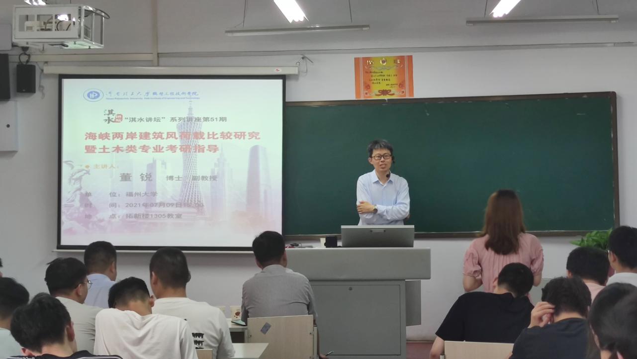 7月9日,鹤壁工程技术学院举办“淇水讲坛”第51期,福州大学土木工程学院董锐博士应邀莅临学院为师生作题为《海峡两岸建筑风荷载比较研究暨土木类专业考研指导》讲座。土木工程系师生70余人聆听。讲座由副院长法冠喆主持。