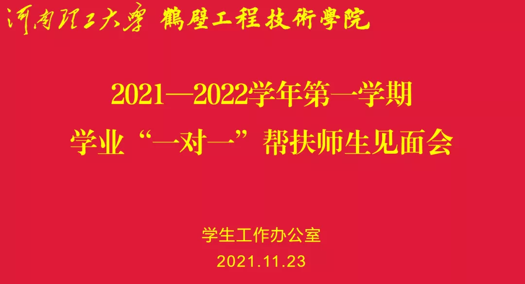 为进一步落实立德树人根本任务,持续培育优良学风,鹤壁工程技术学院召开学业“一对一”帮扶师生见面会,介绍帮扶学生的基本情况,明确帮扶教师的工作目标,强调工作要求。