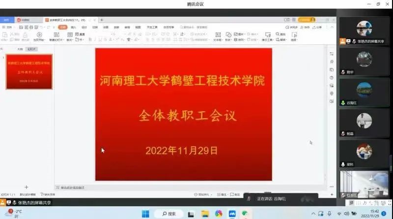 11月29日下午,鹤壁工程技术学院在腾讯会议召开全体人员会议,传达市疫情防控办工作要求,进一步分析研判形势,明确下一步重点任务和要求。全体教职工参加会议。