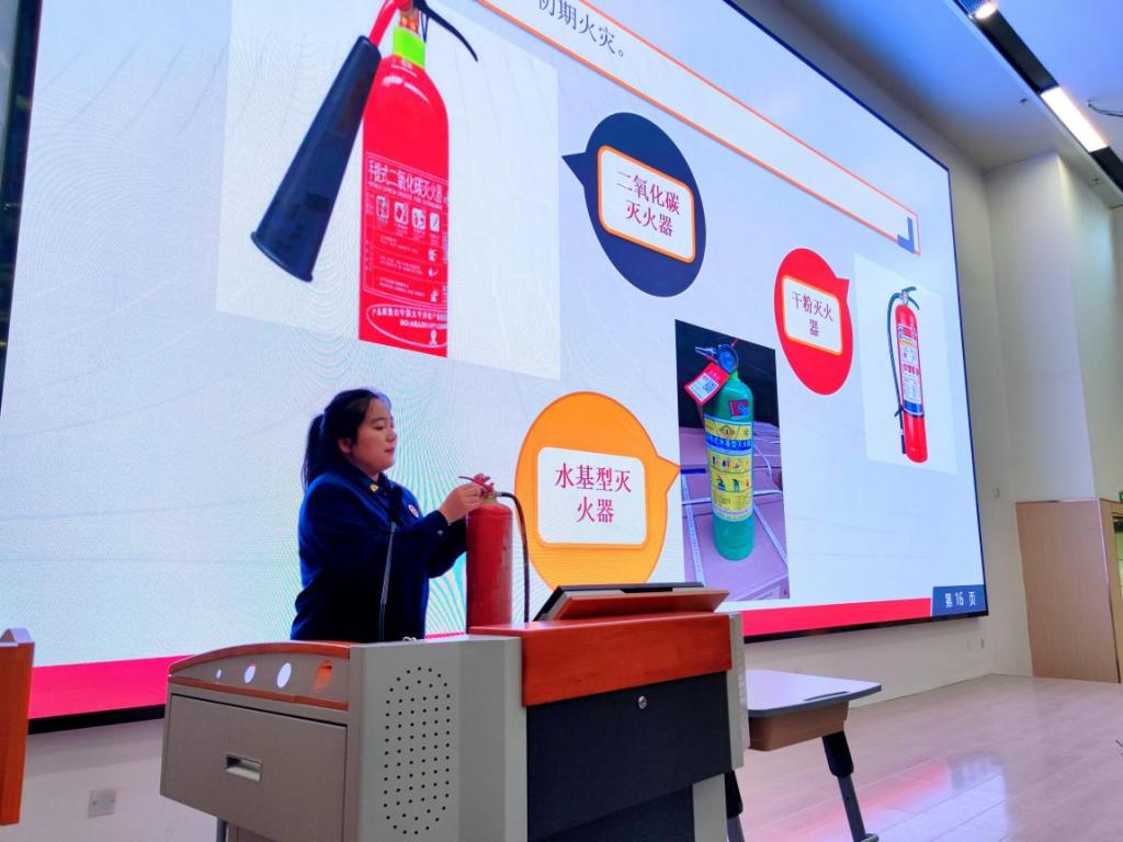 本次特邀鹤壁市淇滨区消防救援大队贺坤明参谋一行四人到校宣讲,陈黎冰老师精心准备了宣讲PPT和视频,以真实案例作证,结合亲身示范,对与会人员进行了全面专业的讲解和指导。