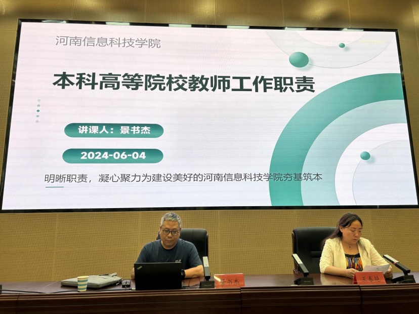 6月5日下午,筹建处在报告厅举办“凝心聚力,蓄势待发”教师专题培训第九讲,邀请河南理工大学原数学与信息科学学院教学副院长、继续教育学院副院长,现河南信息科技学院筹建处特聘教育专家景书杰开展题为“本科高等院校教师工作职责”的专题讲座,全体教师参加培训。