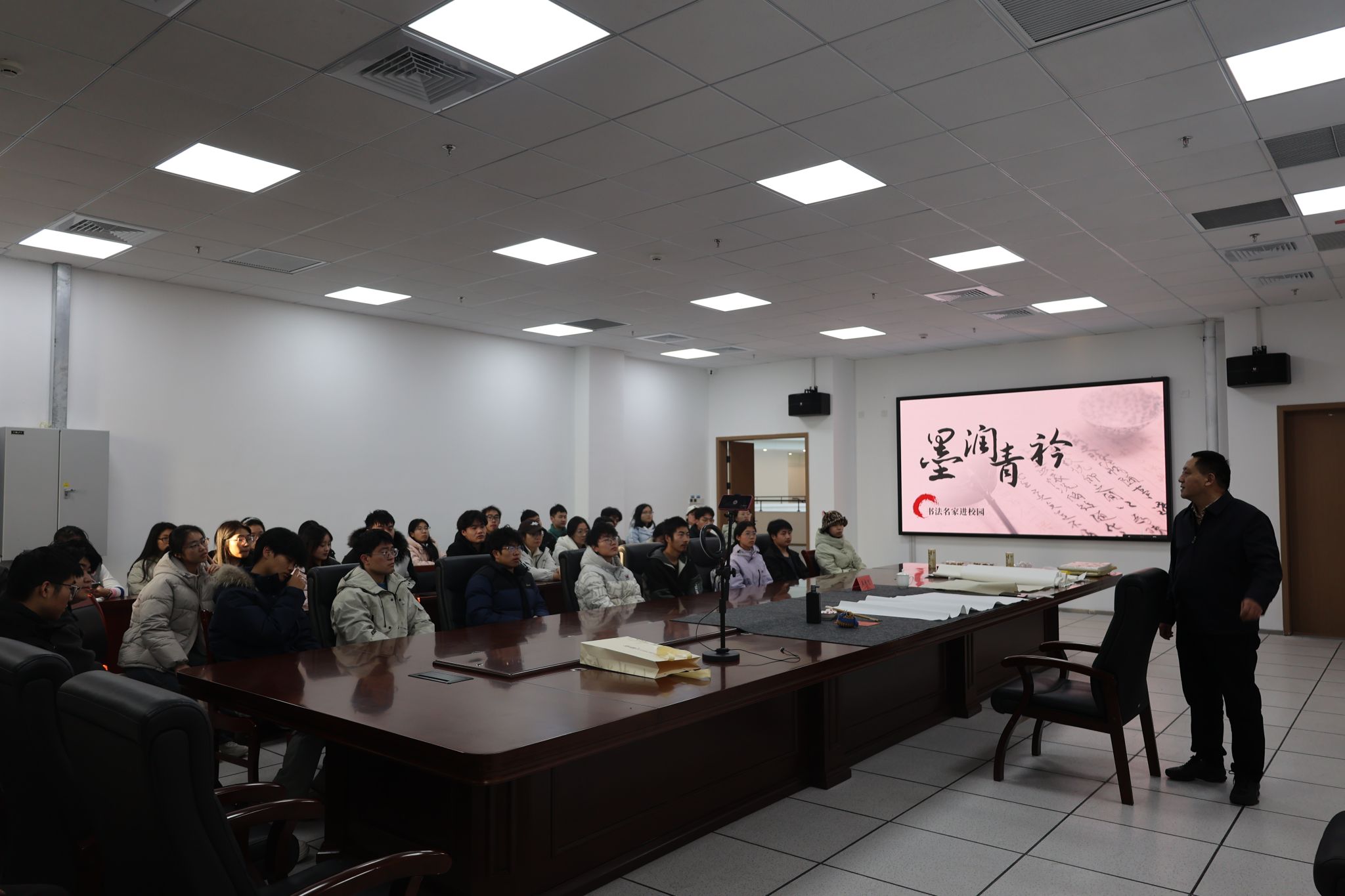 为弘扬中华优秀传统文化,营造浓厚校园艺术氛围,学院于12月27日上午在公共学习中心第三会议室成功举办“墨润青衿—书法名家进校园”活动。活动特邀鹤壁市书法家协会主席、学院特聘教授孟庆宽亲临指导,吸引了众多师生书法爱好者积极参与。