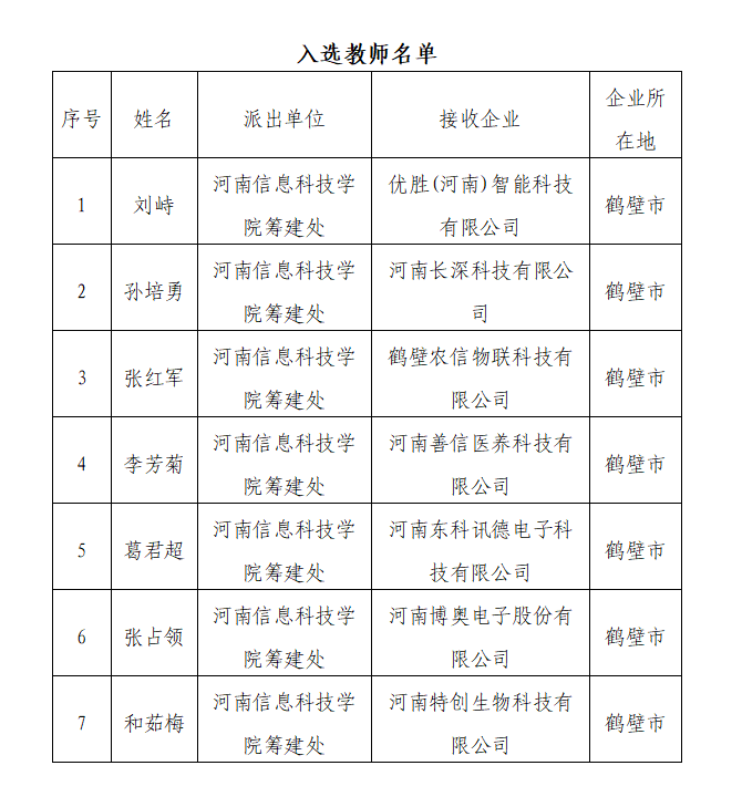 12月29日,中共河南省委组织部、河南省科学技术厅、河南省教育厅联合公布了2025年度河南省“科技副总”入选名单。河南信息科技学院筹建处刘峙等7名教师名列其中。