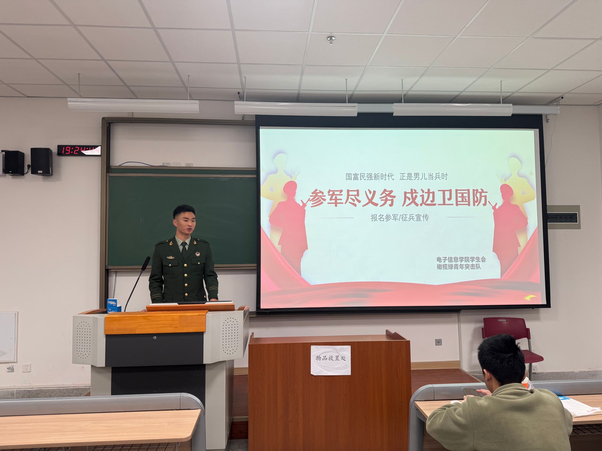 为激发莘莘学子的参军热情,强化国防意识,电子信息学院学生工作办公室精心筹备。12月17日晚,邀请橄榄绿突击队的退役士兵们进班级,开展了一场激情澎湃的征兵宣讲会。这些曾在绿色军营中淬炼过的热血青年,满怀豪情地分享了他们的军旅生涯,用亲身经历点燃同学们心中的报国之火,为校园注入了一股磅礴的强军力量。