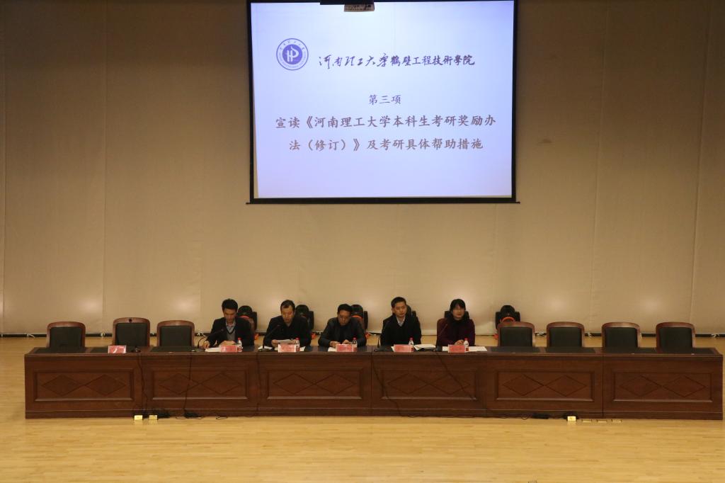 为进一步促进学风建设,鼓励学生考研,3月13日下午,河南理工大学鹤壁工程技术学院在图书馆诚信礼堂召开学生大会暨考研动员会。学院党委书记赵贵生、副院长谷海红出席会议。全体师生参加了会议。会议由综合办吴艳华主持。