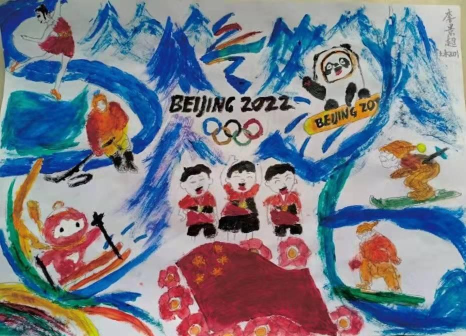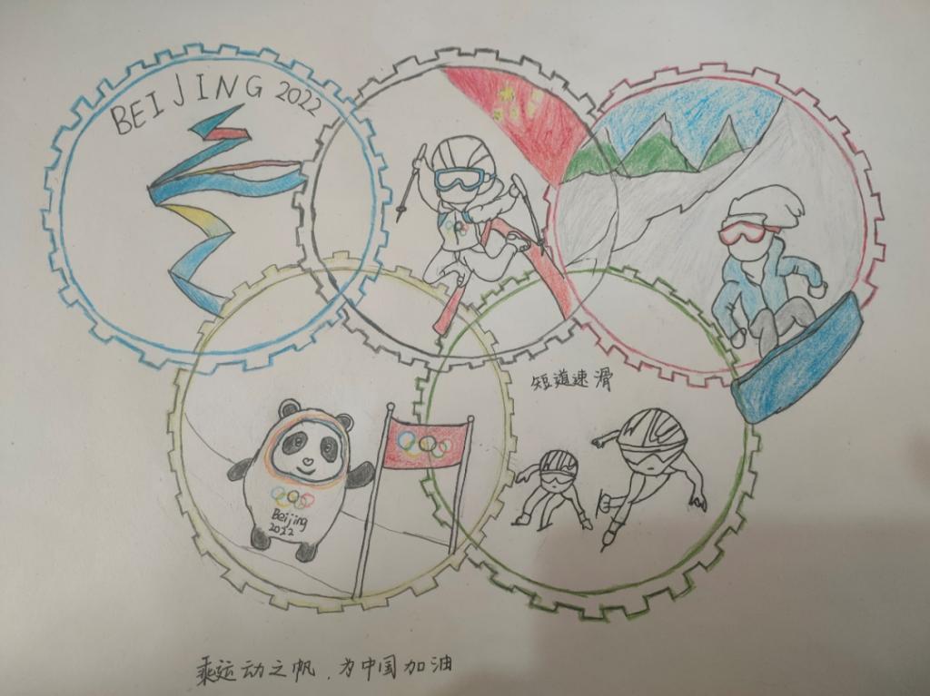 作品介绍:这幅作品突破画纸限制,以奥运五环为界限,奥运五环如齿轮啮合在一起,五环内画了冬奥的吉祥物和中国健儿在不同赛场上拼搏的形象,祝愿北京冬季奥运会圆满举办。