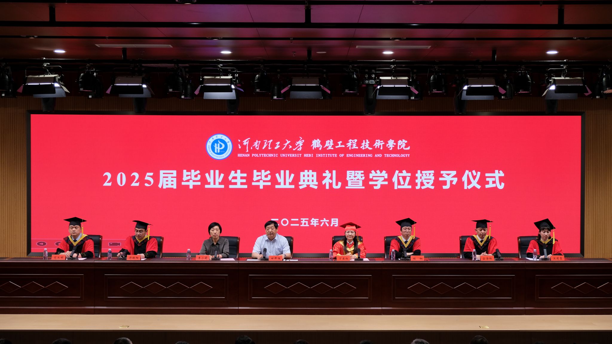 2025年6月11日,河南理工大学鹤壁工程技术学院2025届毕业生毕业典礼暨学位授予仪式在公共学习中心报告厅举行。河南理工大学副校长丁亚红,市委常委、组织部部长、河南信息科技学院筹建处党委书记田开胜,副市长、河南信息科技学院筹建处主任李小莉,河南理工大学鹤壁工程技术学院院长谷海红出席。河南理工大学、河南信息科技学院筹建处相关职能部门负责同志,教师代表和2025届毕业生代表参加。仪式由田开胜主持。