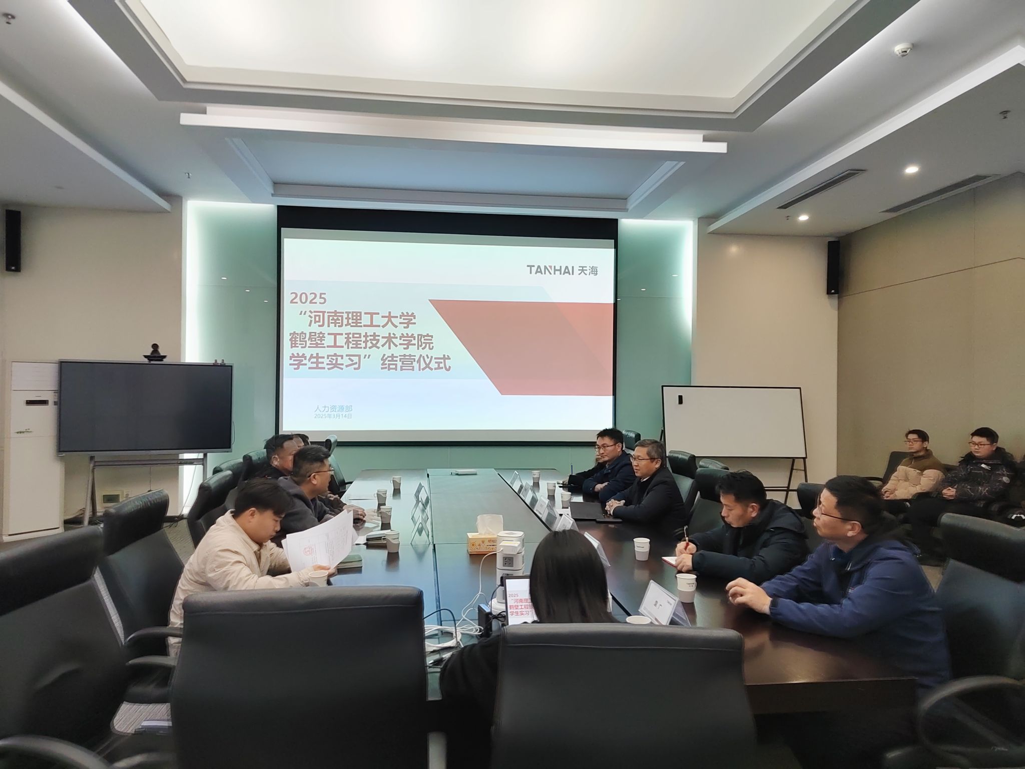 2025年3月14日下午,智能制造学院2025届在鹤壁天海电子信息系统有限公司(以下简称天海电子)参加毕业实习的毕业生结业仪式在天海电子会议室举行。结业仪式由天海电子人事经理杨钦钦主持,天海电子人事总监齐金明、工会主席张志国、河南理工大学鹤壁工程技术学院副院长李天子及相关负责人、全体实习学生参加仪式。