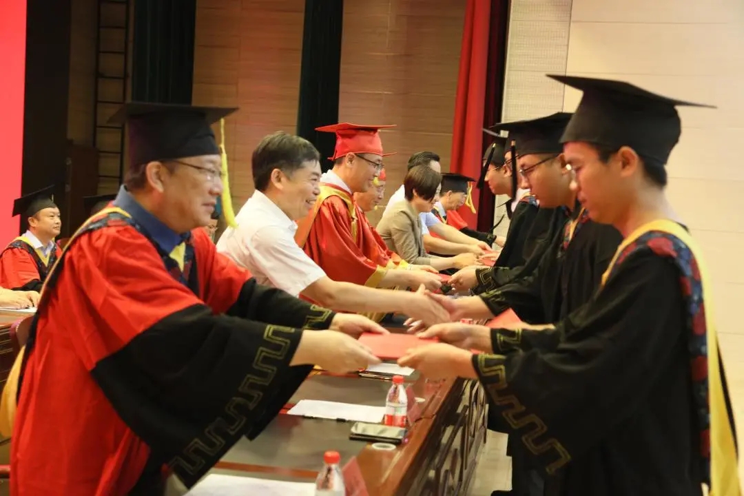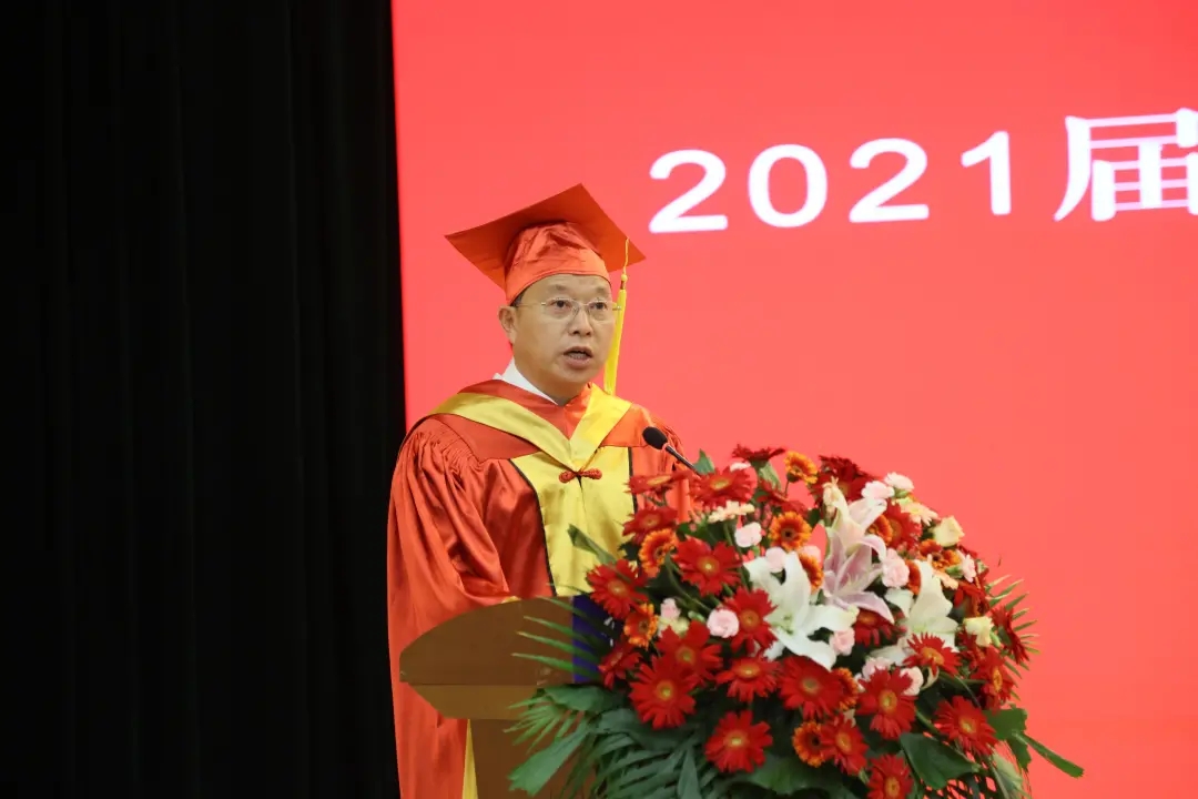 仪式在雄壮的国歌声中开始。蔡太生、沈记全先后宣读了河南理工大学关于颁发2021届本科生毕业证书、授予本科毕业生学士学位的决定。典礼进行了隆重的颁发证书仪式,主席台就座的领导为毕业生代表拨正流苏,颁发证书。教师代表康智慧老师、毕业生代表王晨雨同学作了精彩发言。