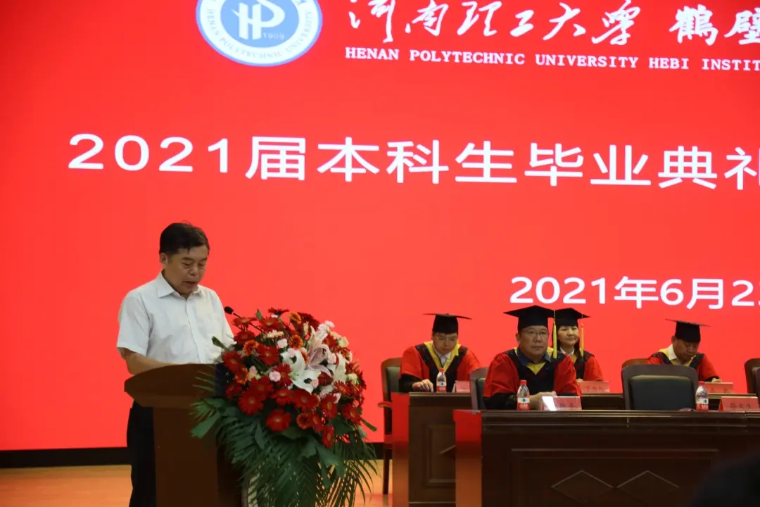 杨小林在讲话中回顾了鹤壁市政府、河南理工大学深化合作推动鹤壁市本科高等教育实现高质量发展的办学历程,对鹤壁工程技术学院按照河南理工大学学院工作标准,积极构建应用型本科人才培养模式和管理机制,在办学规模、人才培养、社会服务以及河南理工大学鹤壁研究院和博士工作站建设等方面取得的突出成绩给予了充分肯定和高度评价,对同学们圆满完成学业表示祝贺。他指出,同学们在鹤壁市委市政府的亲切关怀和学校老师的精心培养下,在“明德任责”校训、“好学力行”校风等学校核心价值理念的熏陶下,理想信念进一步坚定,能力本领进一步提升。他希望同学们弘扬家国之情怀,学习好党史这门必修课,传承母校的家国情怀,家国入心、情怀筑梦、立报国志,做新时代的奋斗者和建设者;勇担历史之使命,在未来的人生道路上,传递母校的价值和情怀,成就母校的光荣与梦想,迎时代潮头而立,领时代风气之先,肩负历史使命,坚定前进信心,努力成为堪当民族复兴重任的时代新人;成就创新之梦想,以与时俱进的精神、革故鼎新的勇气、坚韧不拔的定力,肩负起时代赋予的重任,用拼搏和奋斗去成就自己的创新梦想,争做国家高水平科技自立自强的助推人。