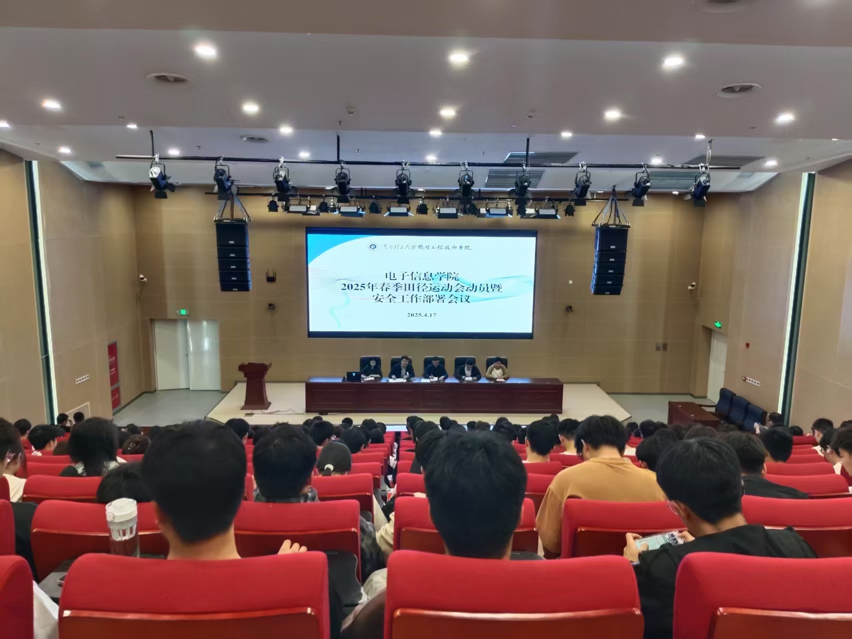 草木蔓发,春山可望。河南理工大学鹤壁工程技术学院2025年春季田径运动会开幕在即,为保障赛事安全有序进行,4月17日晚,电子信息学院在3D-报告厅召开2025年春季田径运动会动员暨安全工作部署会。电子信息学院党总支副书记出席会议并讲话,学工办工作人员、专职辅导员、团总支学生会成员、运动员、专业方阵成员参加会议。