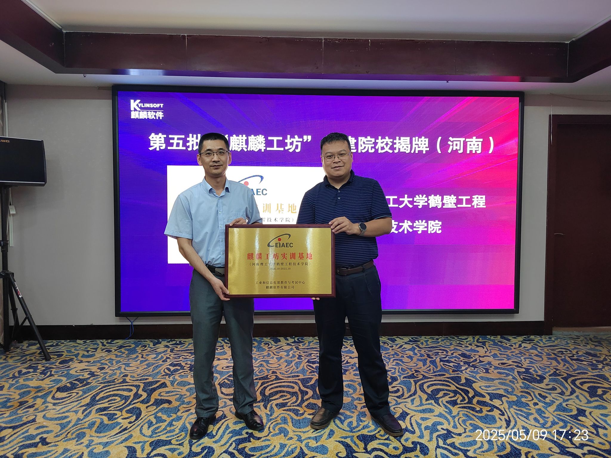2025年5月9日,我校计算机科学与技术教研室主任张曙光应邀参加“2025年河南省麒麟工坊共建院校建设研讨会”,会上,麒麟软件有限公司举行授牌仪式,将“麒麟工坊实训基地”牌匾正式授予我校。