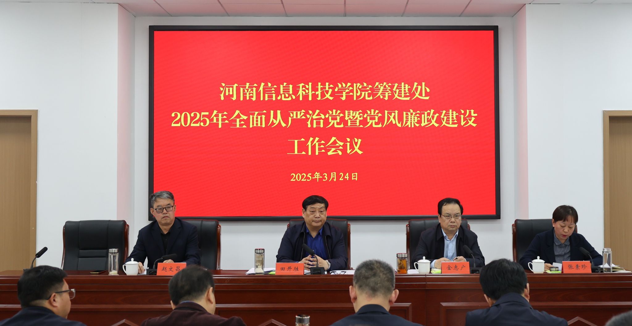 3月24日下午,河南信息科技学院筹建处2025年全面从严治党暨党风廉政建设工作会议召开,筹建处党委书记田开胜出席会议并讲话,市纪委监委驻市教育体育局纪检监察组组长赵文昌到会指导。